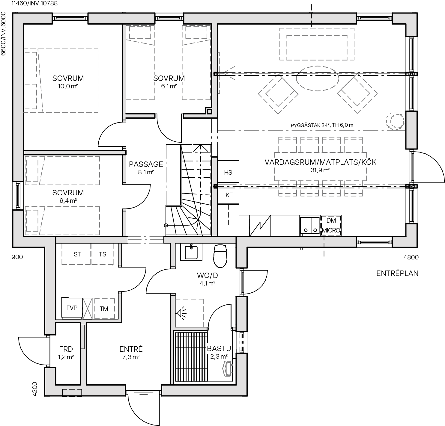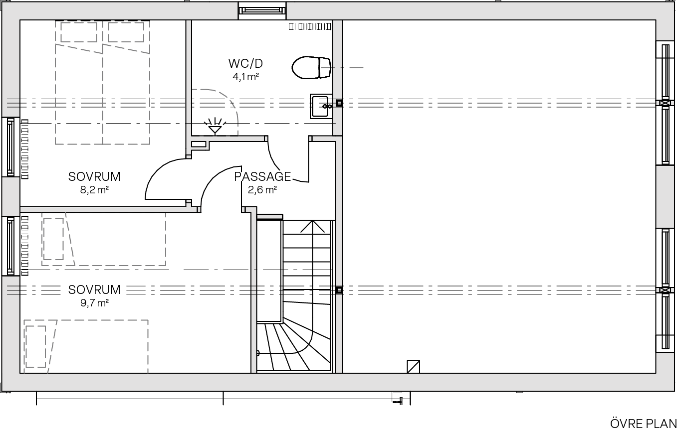 I Storlien finns gott om plats för det stora sällskapet! Huset har fem sovrum fördelade över de två våningsplanen. Varje våningsplan har ett badrum med dusch, och via badrummet på entréplan når man bastun. De generösa sociala ytorna har ryggåstak och de stora fönstren ger ett fantastiskt ljusinsläpp. Här finns även möjlighet att installera braskamin. Huset har ett praktiskt förråd/skidbod som nås från utsidan, alldeles runt hörnet vid entrén.