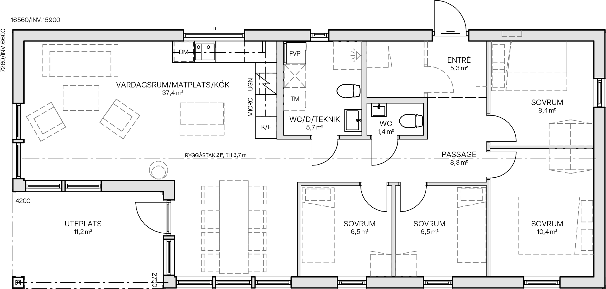 Torekov är ett stilrent hus med plats för många. Här finns fyra sovrum, ett större och tre lite mindre. Huset har ett badrum samt en mindre toalett. Badrummet har dusch och plats för tvättpelare alternativt kombimaskin. Ryggåstak, stora fönster och glaspartier skapar rymd och ger ett generöst ljusinsläpp i de sociala delarna av huset. I allrummet finns möjlighet att installera braskamin. Uteplatsen är skyddad under tak och nås via altandörren vid matplatsen.