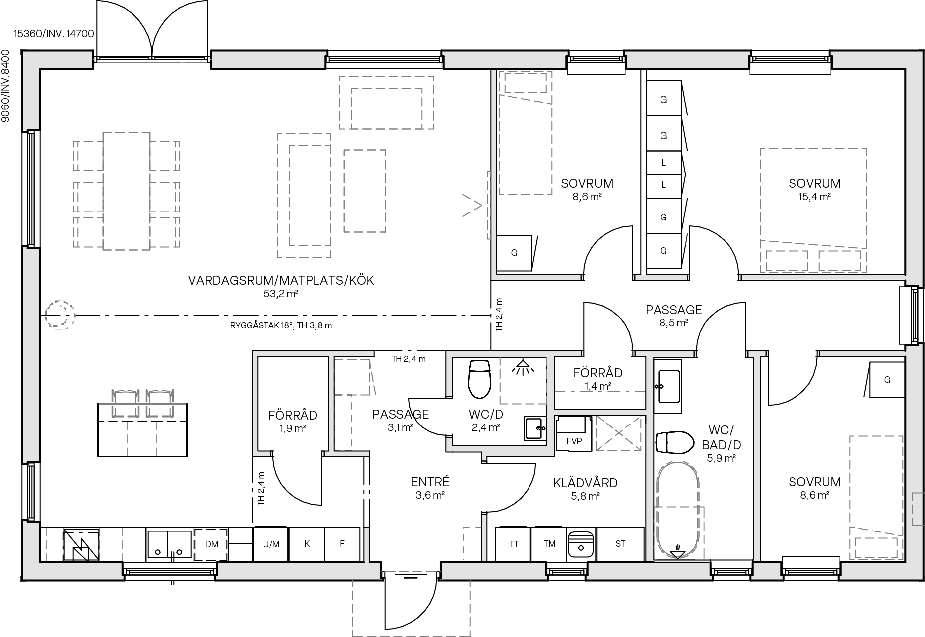 Villa Annedal är ett mycket välplanerat hus med perfekt balans mellan privata och öppna sociala ytor. I direkt anslutning till entrén ligger husets klädvårdsavdelning och en liten toalett med dusch. Från entrén dras blicken rakt igenom huset, ut genom det stora vardagsrumsfönster som vetter mot husets baksida. Ryggåstaket ger de sociala delarna en härlig rymd, samtidigt som de stora fönsterpartierna släpper in generöst med ljus. Köket ligger delvis avskilt men den stora köksön bjuder in till umgänge även här. I köket finns skafferi och huset har över lag gott om förvaring i form av förråd och garderober. En ljus passage binder samman de tre sovrummen och det stora badrummet med resten av huset.