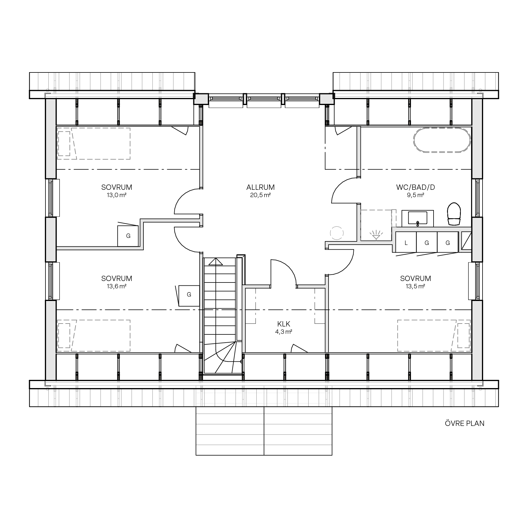 Villa Södergården är ett stort traditionellt hus med fem sovrum. Huset har en klassisk och välplanerad planlösning med gott om plats för hela familjen. På husets ena gavel finns en groventré som leder in i husets klädvårdsavdelning med angränsande klädkammare. På övre plan finns tre sovrum, klädkammare, allrum och badrum. Vackra detaljer, som snickarglädje och förhöjt väggliv, förstärker känslan av klassisk design. Tillval som veranda, takkupa och balkong gör ditt hus ännu mer dekorativt. Södergården är ett av våra Växa-hus, vilket innebär att du kan välja att färdigställa övervåningen i ett senare skede.
