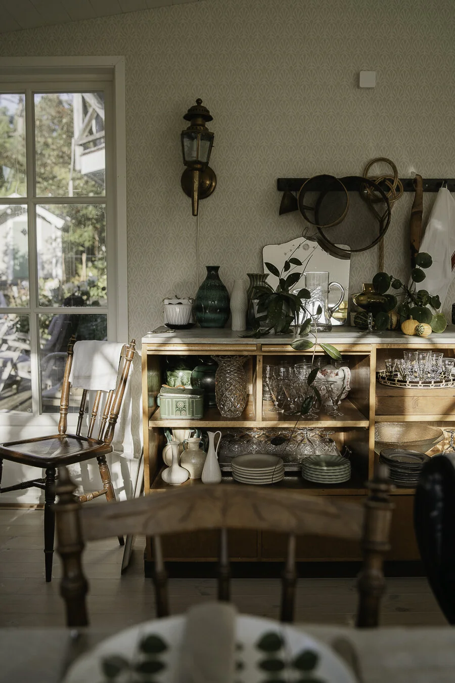 I ett lugnt villa kvarter i Floda hittar vi flera VårgårdaHus som restes för 15 år sedan, men det vi ska få kliva in i tillhör familjen Kollberg och de har också bott här sedan dess. Huset har ett tidlöst uttryck utvändigt och den vackra lockläkten målad i en varm grå ton står sig lika fint fortfarande, snacka om hållbart val av kulör! När man kliver in i hallen slås man av känslan av att verkligen kliva rakt in Marie och hennes familjs hem och vardag med fyra barn. Loppisfynden pryder väggar, golv och i varje rum finns så vackra hörn som lockar till avkoppling och en stunds vila. Ögonen far runt mellan vackra möbler, porslin, tavlor och prydnadssaker och överallt finns små vackra ting att utforska.