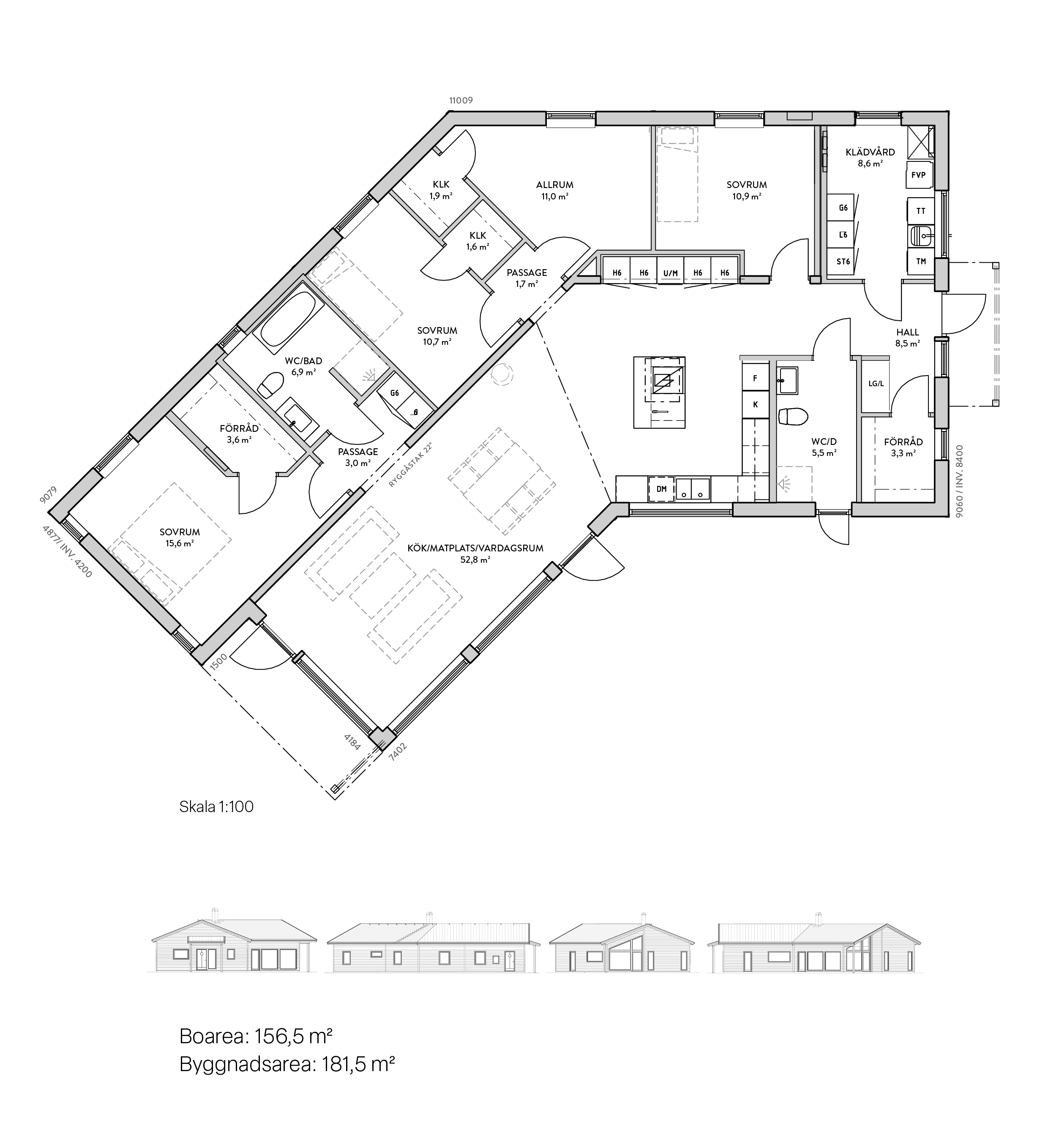 Huset är en moderniserad variant av vår husmodell Djupvik. Genomgående tema för huset är minimalistiskt, funktionellt och kaxigt! De stora fönstren och ryggåstaket i vardagsrummet är helt magiska och köket är verkligen husets hjärta och samlingsplats.